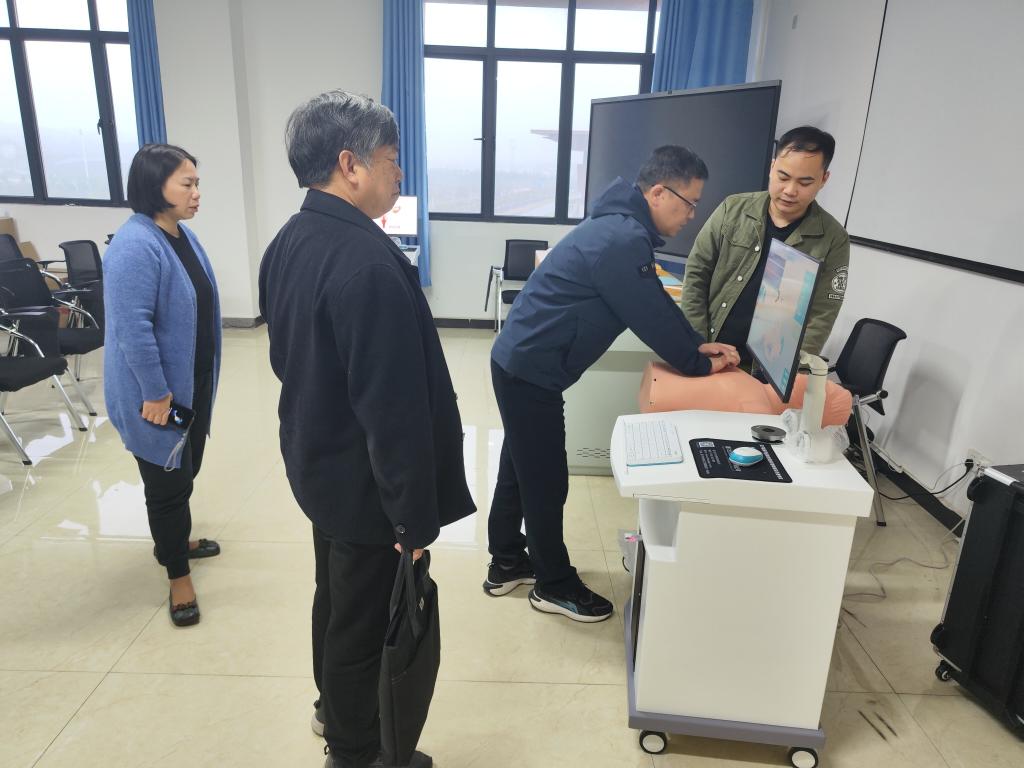 随后由吴少林等陪同考察组前往养老机构模拟区域、“1+X”老年照护实训室、虚拟仿真技术实训室等现场检查,途中就护理学院实训室整体建设情况和教育教学工作进一步开展交流。