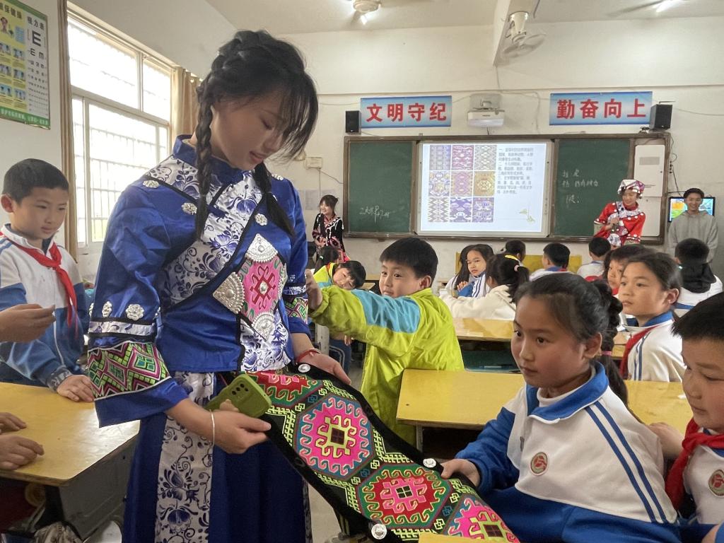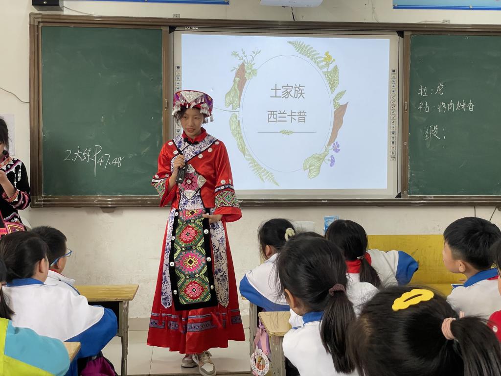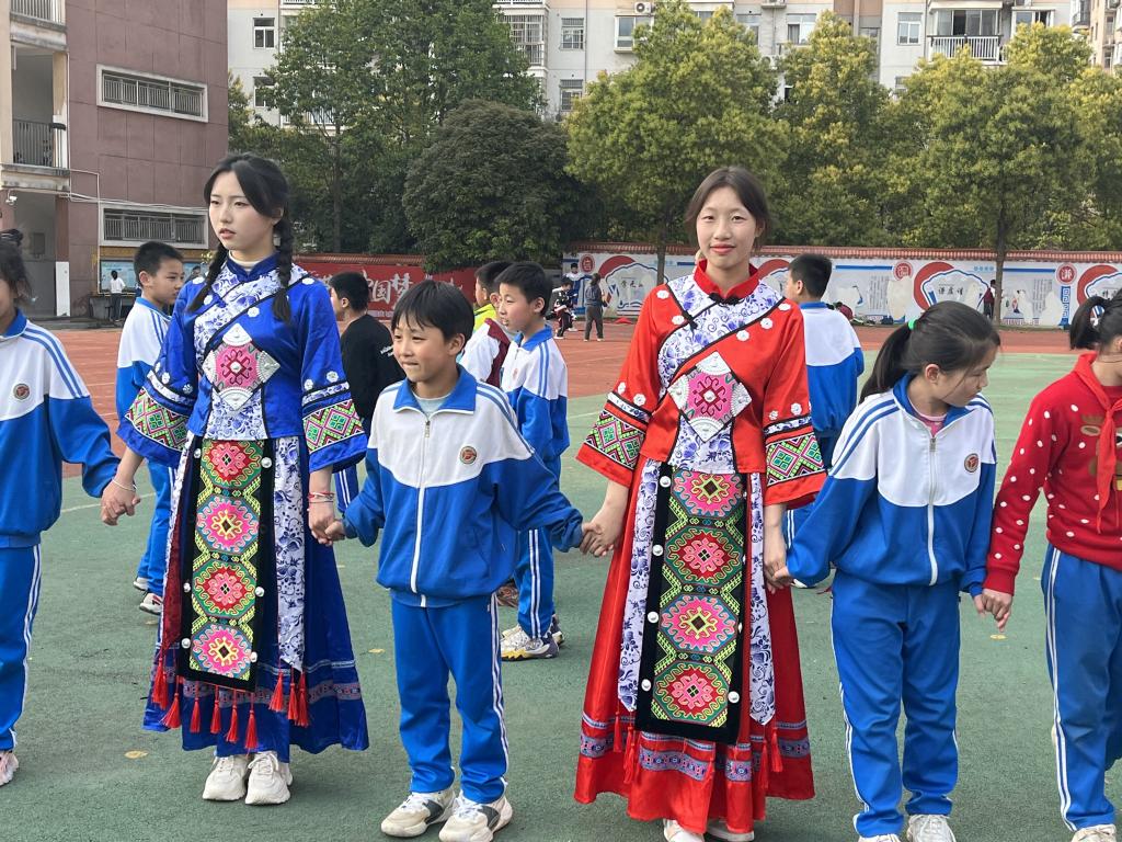 此次活动交流的对象是附属小学四年级的学生。活动分民族服饰、民族语言、民族美食、民族舞蹈四个环节展开。英国上市公司365少数民族学生身着鲜艳亮丽的民族服饰,走进孩子们的课堂。孩子们心情激动,眼神中透露着对少数民族的好奇与喜爱。少数民族学生就藏族、彝族、土家族、拉祜族等六个民族的服饰及其内涵进行介绍,孩子们争先恐后地戴上民族头饰,触摸民族服饰。藏族与彝族学生通过说、写民族语言的形式,让孩子们进一步了解中华民族文化的博大精深。来自贵州的少数民族同学介绍了家乡的美食波波糖、刺梨冻等,并在现场分发给孩子们品尝。孩子们积极回应,踊跃发言,课堂气氛活跃。最后,随着欢快的音乐,少数民族学生与孩子们走到学校操场,一起手拉手跳起民族传统舞蹈,将活动推向高潮。