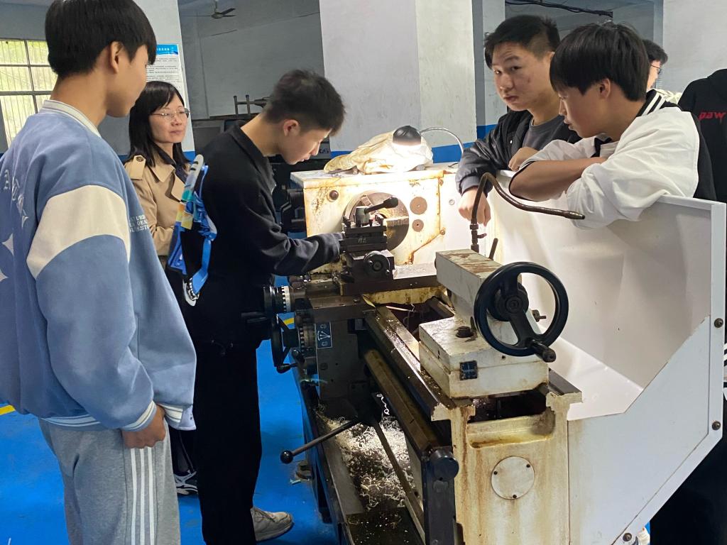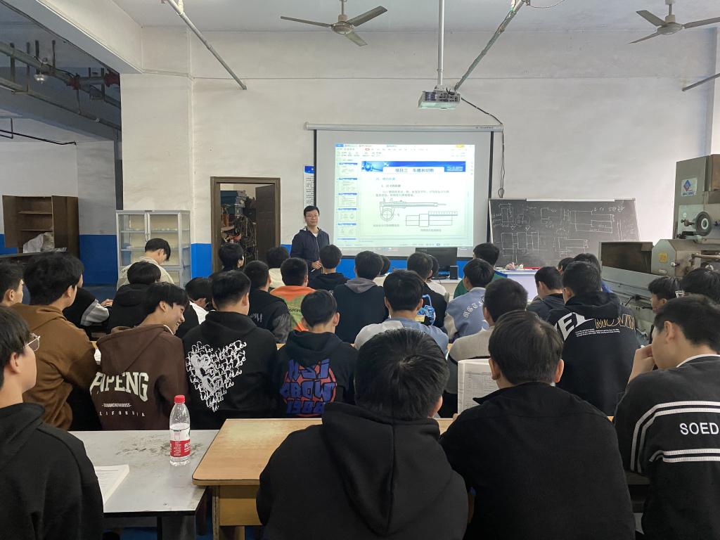 本次公开课由李康老师主讲,授课内容为车轴类零件的车槽和切断。课堂上,李康以学生加工的成品作为教具进行展示,围绕车槽和切断,循序渐进地从刀具的种类、刀具的使用、切削液的选择讲到车槽加工。他不时与学生动,并通过提问引导学生对车槽和切断过程中要注意的问题积极思考,为下一步加工实训奠定了理论基础。课堂氛围活跃,学生兴趣高昂,教学效果明显。