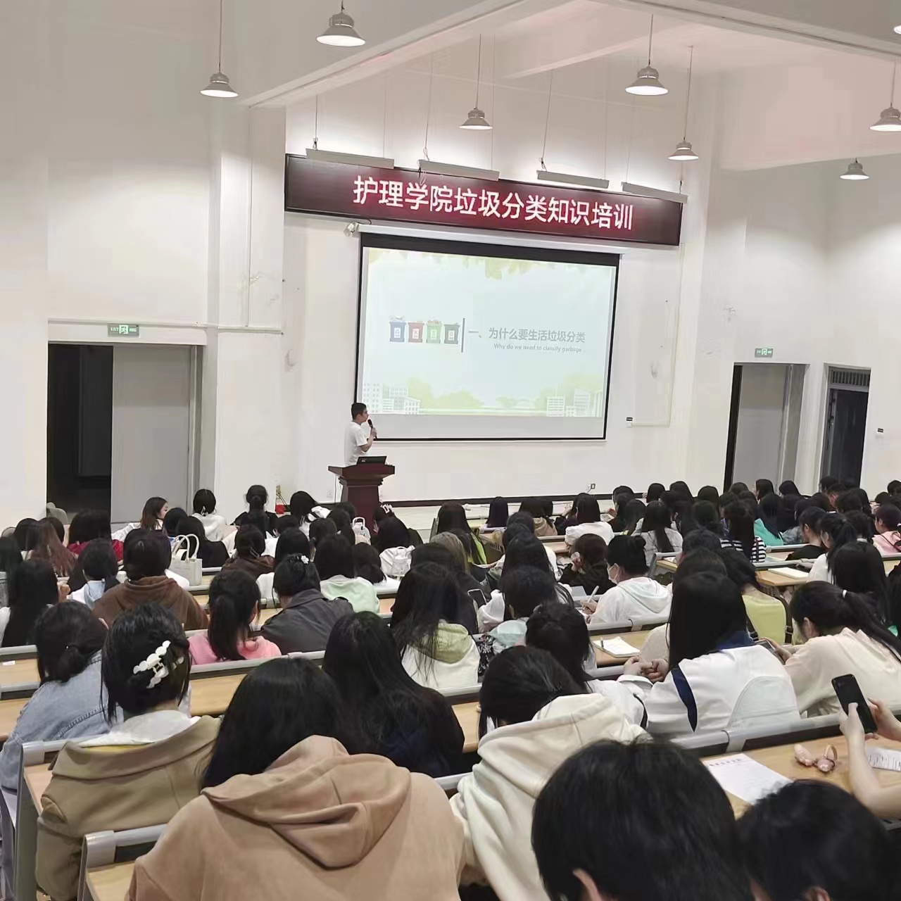 本站讯(护理学院 曲晴 胡祖昌)为进一步提高同学们垃圾分类意识,传播科学的垃圾分类理念,营造和谐优美的校园环境,4月27日,护理学院邀请中梵环保科技何尚强经理在和济楼阶梯教室开展垃圾分类知识培训,各班学生代表参加此次培训。