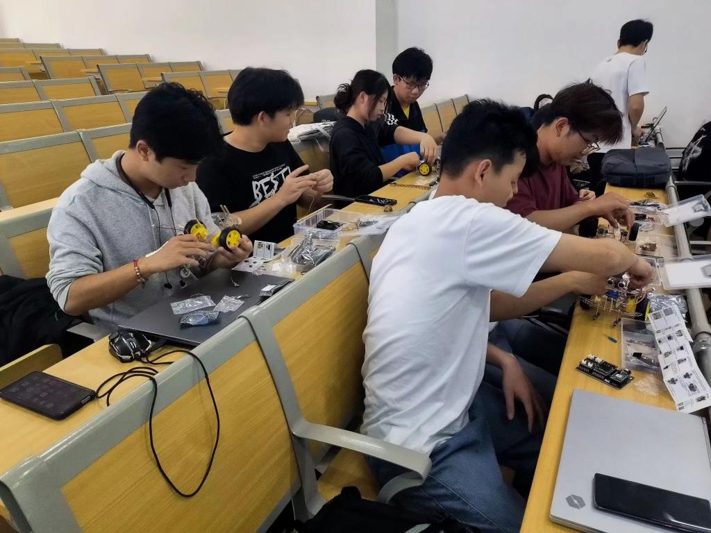 活动中同学们详细了解组装方法及各个零件的功能后开始了智能小车的组装,部件分类、连接整理线路、安装控制驱动和避障模块,组员间互相沟通交流,合作完成了一辆辆小车的组装,装上电池,小车顺利启动完成调试。