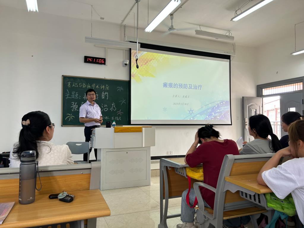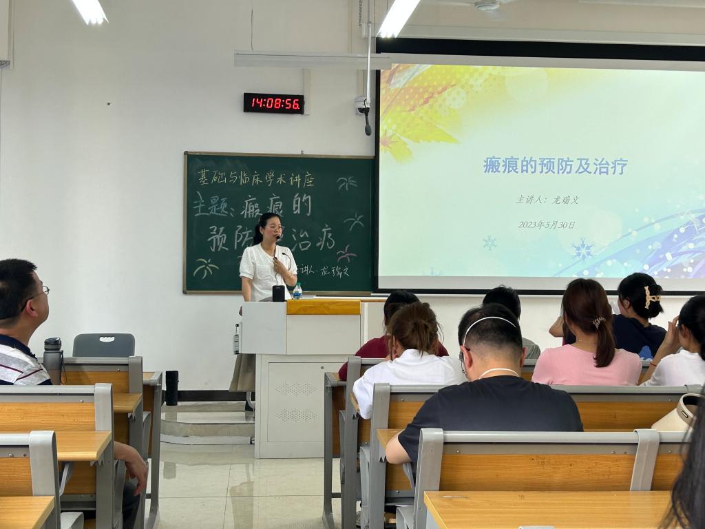 本站讯(医学基础部 尹史帝)为深化党建品牌建设,拓宽学生临床视野,丰富同学们第二课堂学习活动,5月30日下午,由医学基础部主办、医者初心人文社协办的“基础与临床专题讲座——瘢痕的预防和治疗”在和济楼C419教室举行。本次讲座由医学基础部形态教研室龙瑞文老师主讲,医学基础部教师和医学院、护理学院在校学生约110人参加,讲座由医学基础部副主任邓小珍主持。