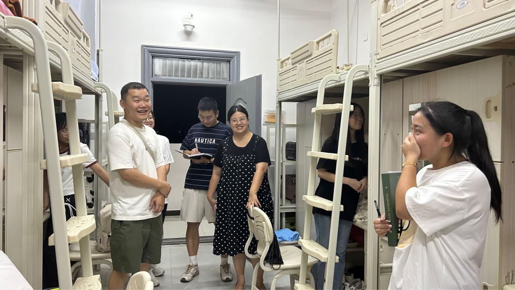 本站讯(国际教育学院 郭学琪 易梦娇)为进一步了解23级新生入学情况,切实体会新生入住宿舍感受,帮助新生更快适应学校、融入大学生活,9月10日晚,国际教育学院党总支书记刘海云、院长王玮、副院长杜欣宇、学团负责老师刘嘉妮以及全体辅导员到新生宿舍走访。