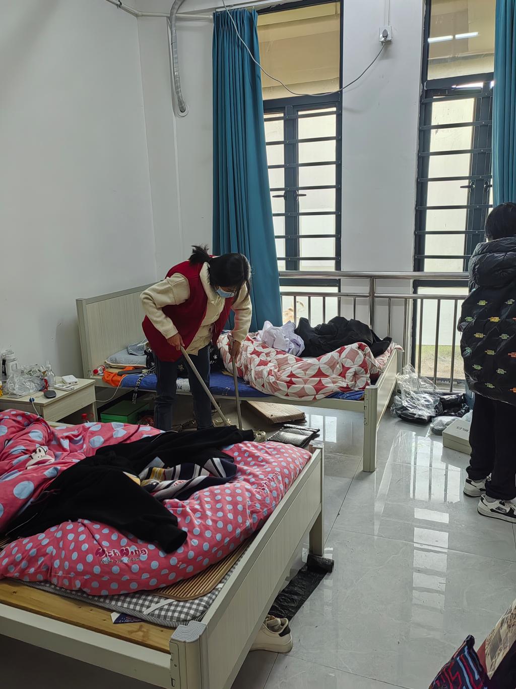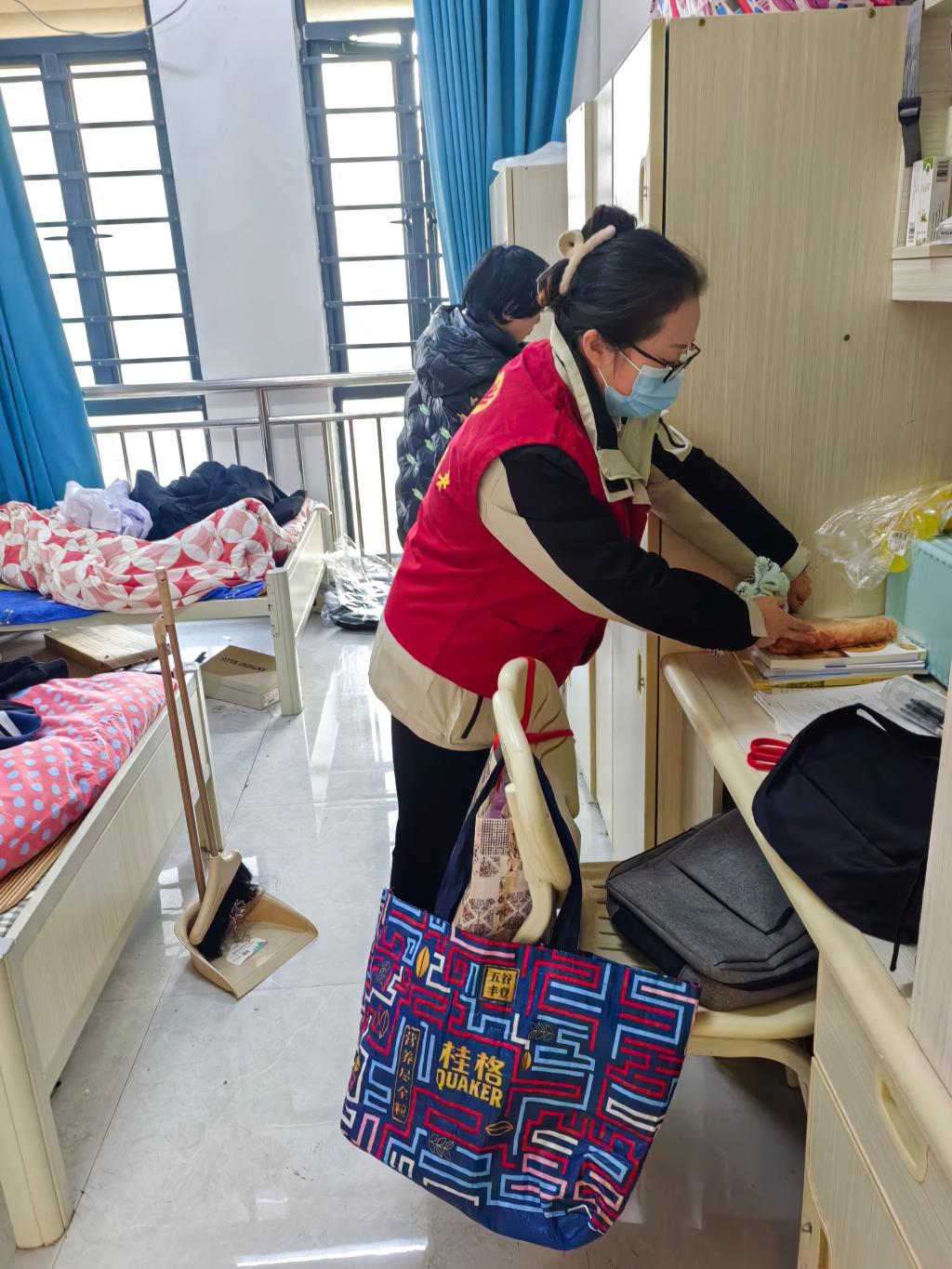 党员同志们来到学生宿舍进行打扫卫生、整理书柜、收拾床铺、开窗通风、洗衣晾衣等活动,同时与学生亲切交谈,探讨学习、生活、个人发展等问题。经过一个多小时的清扫,房间整洁、亮堂。曾同学主动出门倒垃圾,看着她腿不方便,党员主动上前帮忙,曾同学摆摆手说:“老师,不用,我自己可以,您放心”。看着她走向无障碍通道的背影,老师们觉得孩子们逐渐成长独立起来。