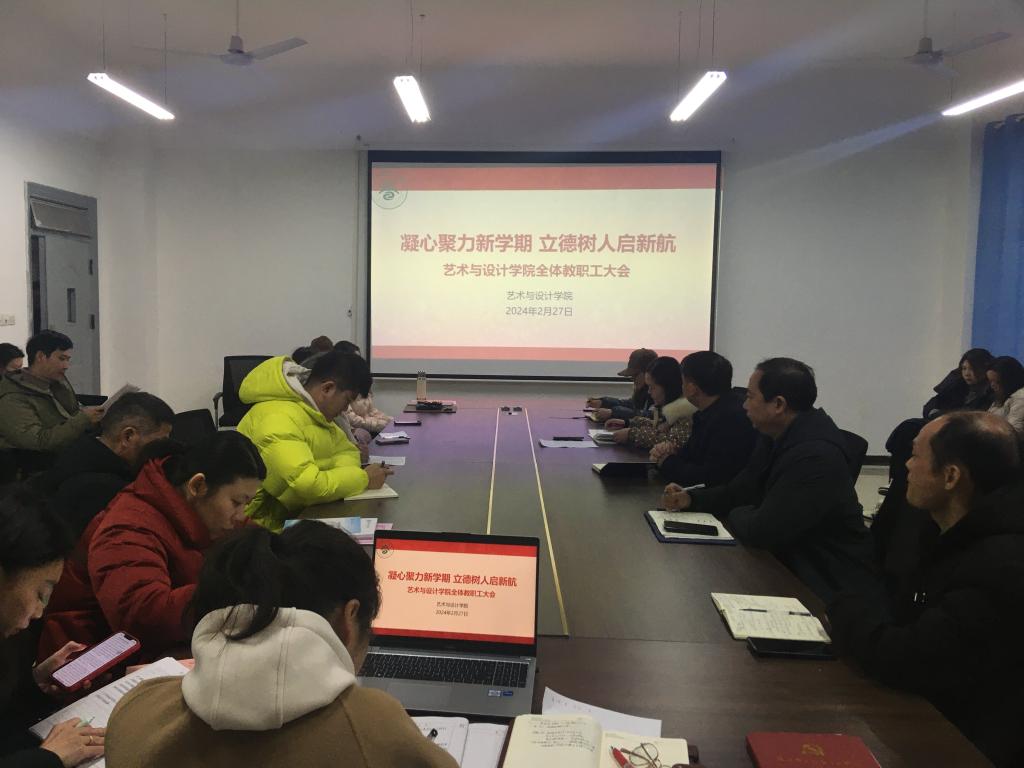 本站讯(艺术与设计学院 汪腾飞)新学期伊始,为更好开展各项教育教学及学生管理工作,2月27日下午,艺术与设计学院在博达楼A413召开全体教职工大会,校纪委书记刘平涯出席本次会议并发表讲话。会议由院长黄卉主持,学院党政班子及全体教职工参与。