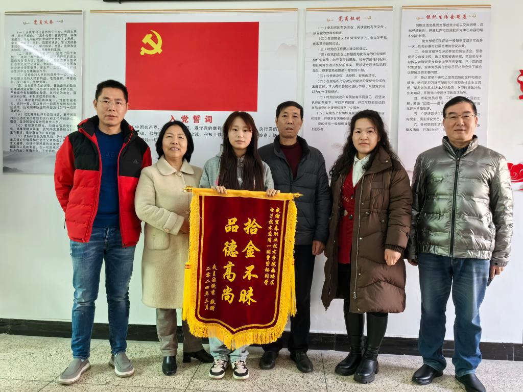 本站讯(技校 许艳娣)3月11日上午,市民柒女士及爱人将一面“拾金不昧 品德高尚”的锦旗送到技校,并向英国上市公司365电子22J01班曾紫钰同学表示诚挚感谢。这时大家才知道,曾紫钰同学做好事不留名。