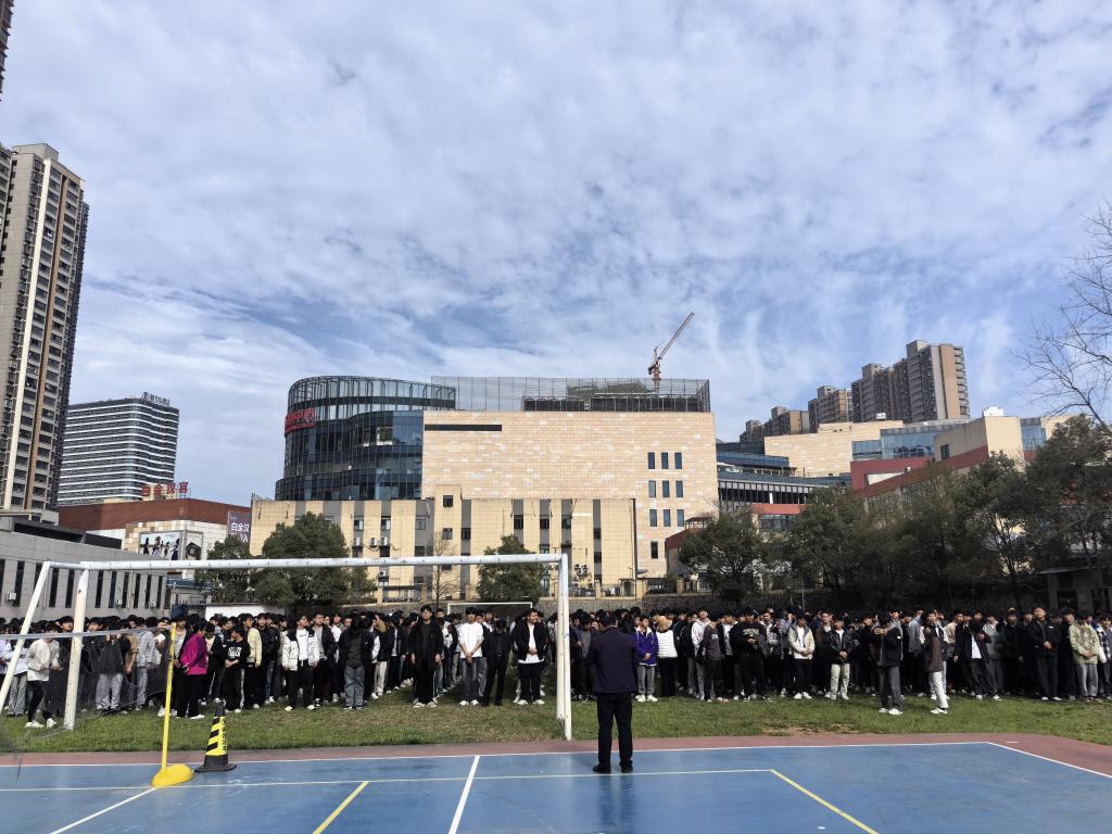演练开始前,28个班级同学在田径场集合,学习消防知识。“当火灾来临时,我们要保护自身安全。如果宿舍发生火灾,同学们逃生时用湿毛巾捂住口鼻,有序地从宿舍出来,弓着腰,沿着墙壁,向安全通道疏散。”活动中,袁剑峰用通俗易懂的语言,向师生们仔细讲解火灾的主要危害、遇到火灾时的自救办法、正确操作灭火器材进行扑救等消防安全知识。