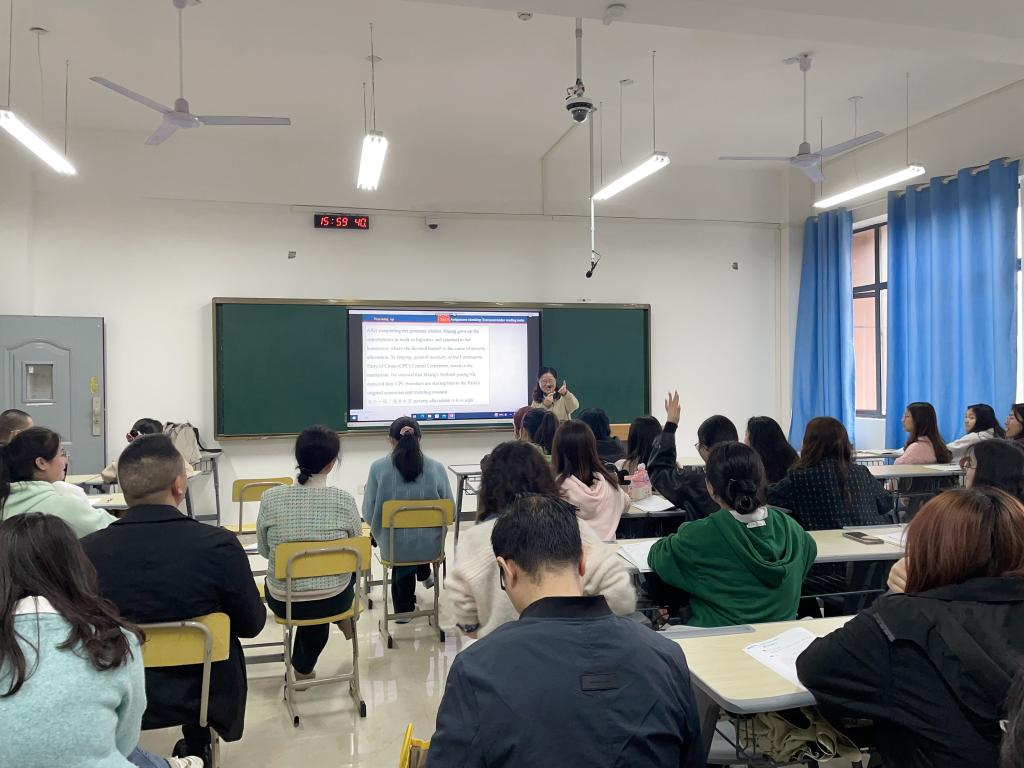 本次教学观摩公开课由国际教育学院小学英语教研室教师刘海云主讲,讲授课程为《英语泛读》。刘海云以公派在伦敦孔子学院任教的教师易辰蔚讲述伦敦生活的视频引入,激发学生学习兴趣,结合上节课学习通问卷调查中的提问——“如果有机会,你是否想在大城市生活?”导入本堂课的课程思政内容,在肯定学生积极探索大城市的进取精神的同时引领同学们学习黄文秀的故事,鼓舞他们将美好青春投身到家乡建设,不忘初心,用青春热血谱写人生赞歌。刘海云的讲授循循善诱,启发式的教学方法锻炼了同学们的思维能力,课堂设计衔接自然流畅,思政元素导入润物细无声。课后,小学英语教研室开展教研室评课活动,教研室教师们积极进行交流研讨,就课堂设计、教学环节、教案课件等方面开展热烈讨论。