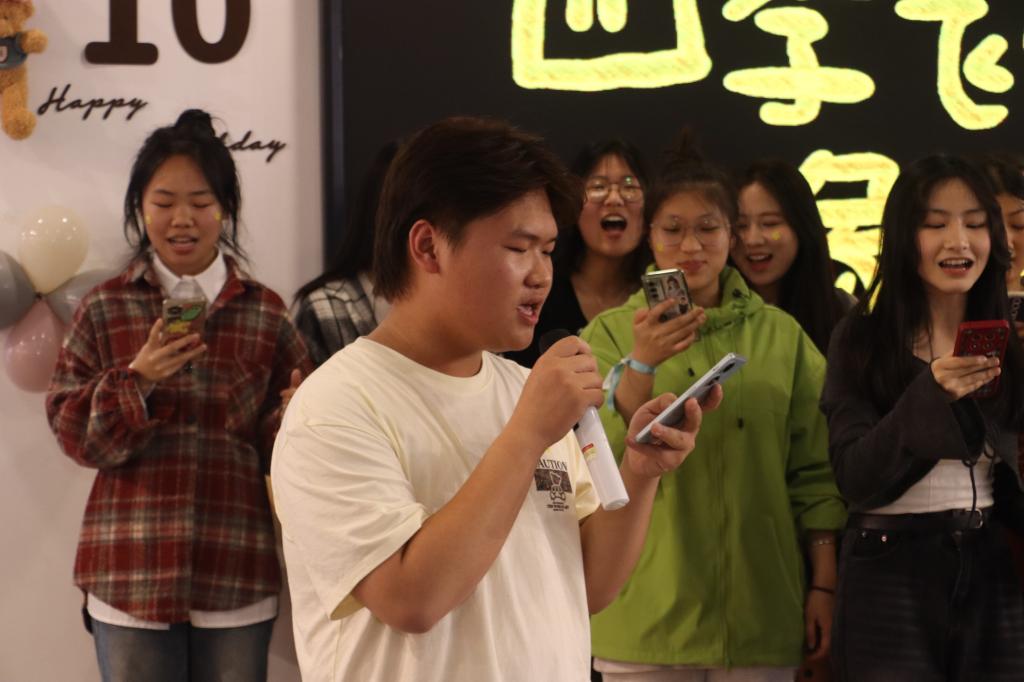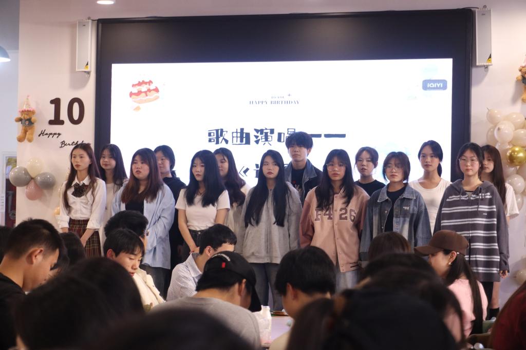 生日会现场,天使合唱团带来歌曲《遇见》,悠长的歌声,让成员们沉浸其中;街舞协会带来舞蹈串烧,炫酷的街舞,引得路过的同学们纷纷驻足;还有互动游戏“盲猜程度大PK”“不要这样做”等,将现场气氛推向高潮。最后,小青团成员带来合唱歌曲《像你这样的朋友》,满怀深情的歌声和极富故事感的歌词,感染了在场的每一位。歌曲结束后,小青团全体成员合影留念。