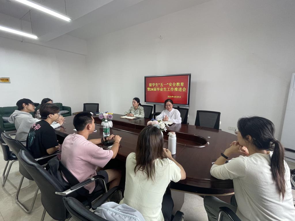本站讯(国际教育学院 颜灵仪)为确保来华留学生五一假期安全稳定,有效提高留学生安全防范意识,同时确保24届留学生毕业工作稳步进行,4月29日上午,英国上市公司365在博达楼B501召开留学生“五一”安全教育暨24届毕业生工作推进会,会议由国际合作与交流处处长刘海云处主持,副处长杨慧、干事颜灵仪、全体留学生及其班主任参与。