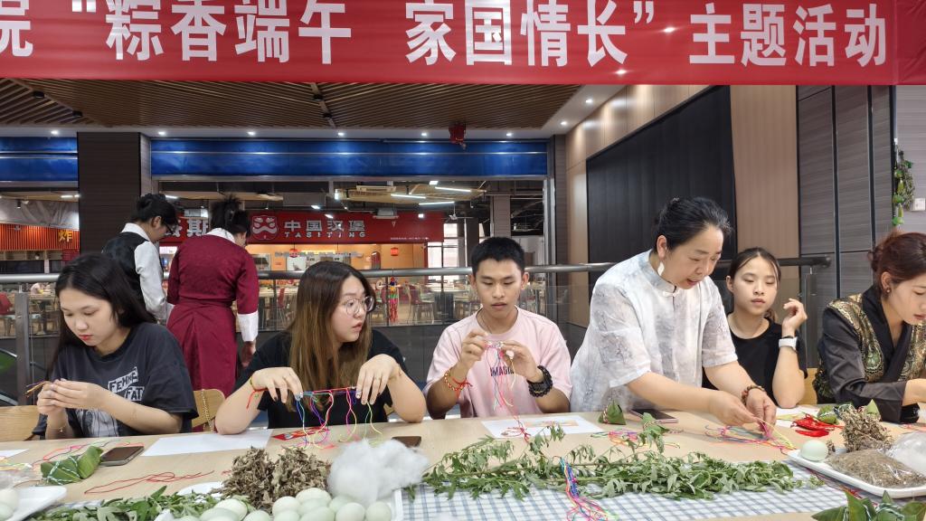 校工会的赵红斌老师为同学们讲述端午节的传统习俗,并教大家编五彩绳手环、做驱蚊香囊.....留学生们听得津津有味,并成功地DIY出自己的作品。留学生开心地说,能够和这么多老师同学们一起过端午非常感动,端午节也是马来西亚的传统节日,也包粽子和划龙舟,我们有共同的节日,虽然身处异国他乡,但是我们感受到了一家亲的温暖。