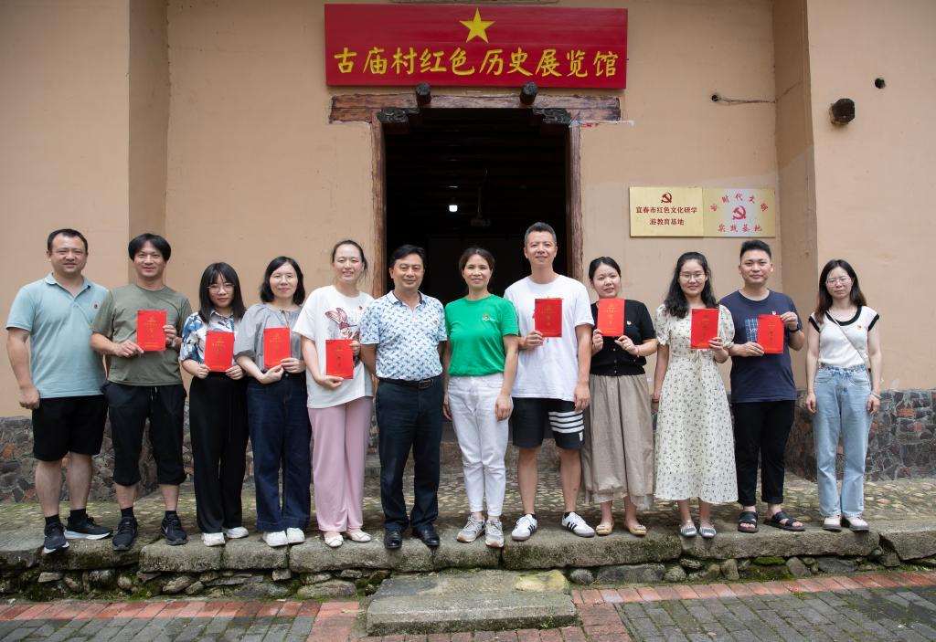 在古庙村红色历史展览馆,一个个红色遗址遗迹,向党员们讲述那段“瑞庆塔下护佑革命火种,爱党拥军难忘鱼水情深”的感人岁月,带领大家回顾1936年时任湘赣临时省委书记谭余保同志带领部队辗转来到明月山,高举镰刀斧头的红旗,坚持战斗的故事。随后,党员们观看《瑞庆塔下永不磨灭的红色足迹》微党课视频。一帧帧画面闪过,一段段文字讲述,革命先辈为了革命胜利浴血奋战的场景仿佛就在眼前。