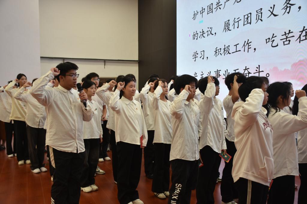 入团仪式在激扬的国歌声中拉开序幕,刘嘉妮担任入团仪式主持人,她宣读完2024年度新发展团员名单后,王玮及各二级学院团总支书记上台为新团员代表颁发团章、团员证并佩戴团徽。仪式在宣誓到新老团员代表发言的程序中进行。同时,王玮对新老成员致以诚挚的祝贺并且提出三点希望,一是牢记入团誓言,勇于担当使命;二是珍惜青春年华,勤奋努力学习;三是秉持诚信品质,加强自身道德修养。仪式在悠扬的团歌声中圆满结束,大家从仪式的九个程序中共同见证了所有新团员成长历程中意义非凡的瞬间,他们将带着共青团的光荣与使命,开启人生新的征程。