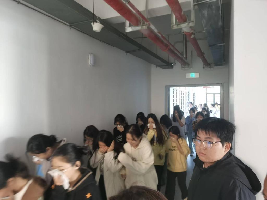 随着一阵急促的警报声响起,演练正式拉开帷幕。指挥小组迅速启动应急预案,宿舍各楼层学生立即听令而行,按照演练方案和指定疏散路线捂住口鼻,弯着腰快速有序地撤离,整个演练做到了快速、安全、有序。