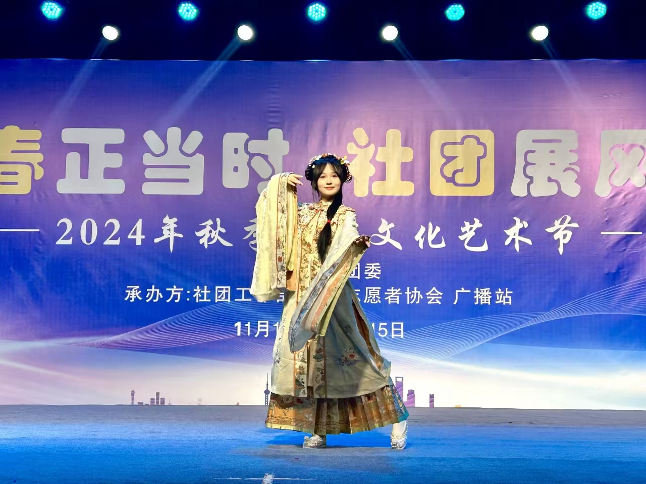 GAC舞社的开场舞《How sweet》瞬间点燃全场,青年志愿者协会带来的歌曲《新贵妃醉酒》惊艳全场,戏曲京剧扮相与现代戏腔歌曲相结合,充分展现了中华优秀文化的创新发展。槿瑜汉服社的汉服暖场走秀活动为大家呈现了一场美轮美奂的视觉享受。窈窕女子着华服、舞长袖,仿若画中仙,桃面书生执亮扇、展儒雅,尽显古典韵,陆续上台的社团表演生动诠释了青春的意义,引得台下掌声不断。