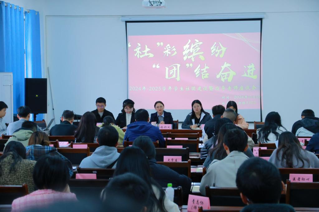 本站讯(团委 钟泽宇 学生记者 况睿 吴钰昕)为深入学习贯彻习近平新时代中国特色社会主义思想和党的二十大精神,贯彻落实习近平总书记关于高校思想政治工作和青年工作的重要论述,切实加强学校学生社团建设管理,深化学生社团的学习与育人功能,推进学生社团健康有序发展,11月19日下午,2024-2025学年学生社团建设暨指导老师座谈会在日新楼A302会议室召开。副校长张彩凤,各二级学院团总支、各协会社团指导老师及校团委全体工作人员出席会议,会议由团委书记王玮主持。