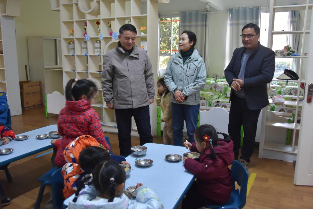 刘平涯走进各年级教室,仔细察看幼儿用餐情况,询问“饭菜有没有保温措施?”“幼儿两餐两点里有牛奶吗?”在幼儿寝室,刘平涯关切地问“小朋友中午睡觉冷不冷?被子多久换洗一次?”在员工食堂,刘平涯察看了食堂环境和“日管控周排查”记录表,并现场陪餐。随后,他还仔细翻阅了家长陪餐记录及意见反馈表等。