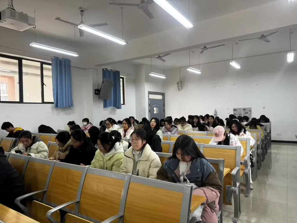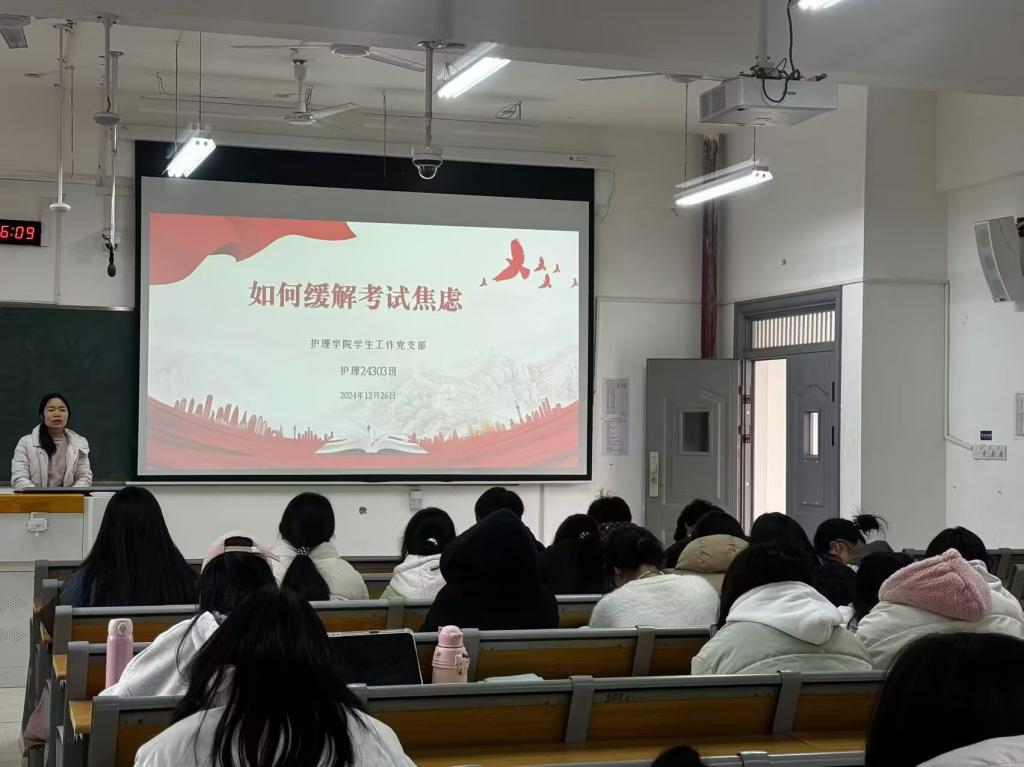 本站讯(护理学院 黄成 学生记者 刘丹 方佳琪)为帮助同学们缓解考试焦虑情绪,释放压力,培植信心,12月26日下午,护理学院学生工作党支部在和济楼C320开展“如何缓解考试焦虑”为主题的支部联系班级活动,支部党员陈丽红老师担任主讲,护理24303班全体同学参加。
