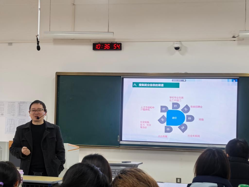 袁老师从就业信息搜集的重要性、渠道选择、筛选技巧及案例分析进行详细讲解。他指出,就业信息是求职的核心要素,有助于把握市场趋势、明确职业定位并制定有效策略;他列举了多种信息渠道,如学校就业指导中心、招聘网站、社交媒体及行业论坛等,建议学生根据职业规划、兴趣和能力筛选职位,建立个人就业信息库;通过案例分析,他展示信息搜集的实际应用,分享成功求职经验,鼓励学生充分利用资源提升求职成功率。课堂上,袁老师与学生深入交流,解答疑问并提供实用建议。