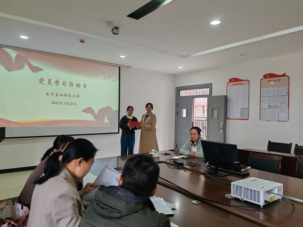 本站讯(医学基础部党支部 金晶)为深入学习习近平新时代中国特色社会主义思想,强化党员身份意识和责任担当,3月25日下午,医学基础部党支部组织开展3月主题党日活动,支部全体党员参加,活动由支部书记周俊杰主持。