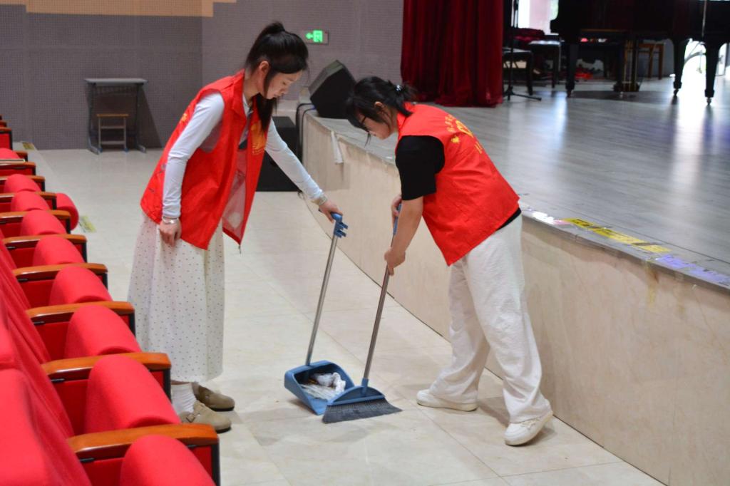 6月5日,艺术与设计学院组织党校培训发展对象及入党积极分子到博达楼小礼堂开展“美化礼堂环境 共享整洁空间” 专项打扫行动。参与者按区域被划分为三组,各设组长统筹协调。在负责人的统一调度下,小组成员迅速投入工作,有的专注擦拭座椅积灰,有的细致清扫地面杂物,有的深入舞台后台清理卫生死角。扫帚挥动、抹布擦拭的声音交织,勾勒出齐心协力的劳动画面。