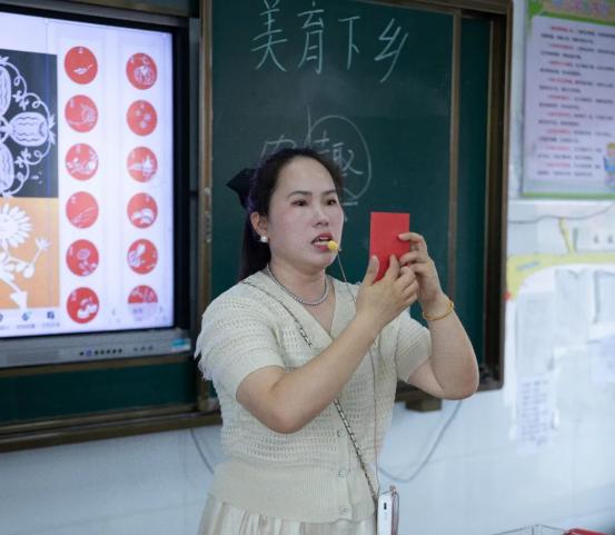 “芒种芒种,连收带种”,在五年级4班,师范学院教师黄丽娟以“农趣”为主题,将蕴含中华智慧的节气文化与传统剪纸技艺巧妙融合。她手持彩纸与剪刀,边示范边讲解,带领同学们了解不同节气适合种植的瓜果蔬菜、常用的农具样貌,鼓励他们发挥想象力,分组创作充满“农趣”的剪纸作品。现场,孩子们构思画面、设计纹样、勾画轮廓。剪刀游走间,古老的农耕智慧与童趣创意碰撞出火花,一幅幅灵动鲜活的剪纸作品映入眼帘。