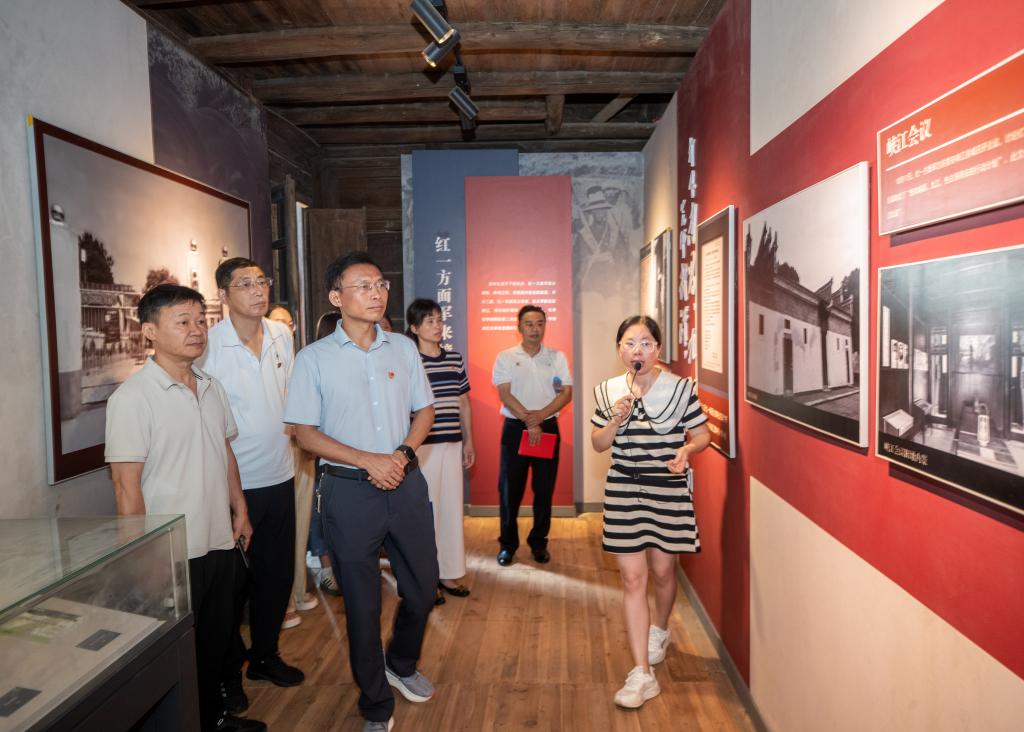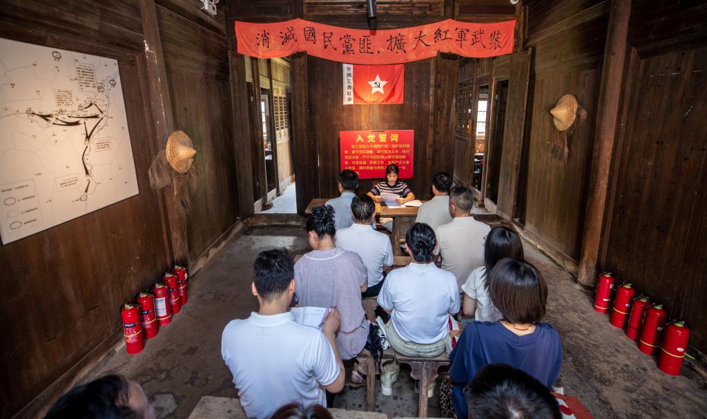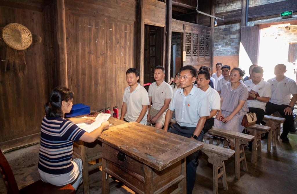 1932年太平会议在此召开,会议严明纪律、整顿作风,为红军发展壮大奠定了坚实基础。全体党员在大学生村官的带领下,怀着崇敬的心情参观了太平圩会议旧址、革命文物陈列馆等场所。斑驳的桌椅、泛黄的文件、简陋的生活用品,无声诉说着革命先辈在艰苦环境中坚守信仰、严守纪律的动人故事
