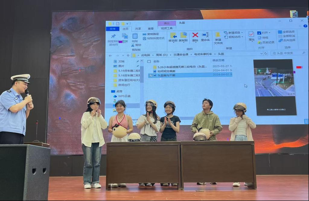 互动环节中,6 名同学上台试戴头盔,民警纠正动作并强调 “前沿低于眉毛、系带可塞两指、晃动不偏移” 的要点,叮嘱同学们做好交通安全宣传员。
