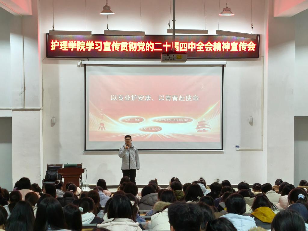 本站讯(护理学院学生记者 王子琳)为深入学习宣传贯彻党的二十届四中全会精神,引导学生增强政治觉悟、强化使命担当,12月15日,护理学院在和济楼阶梯教室开展党的二十届四中全会精神宣讲会。会议由2025年度校青年五四奖章获得者张越主讲,各班级学生代表参加。