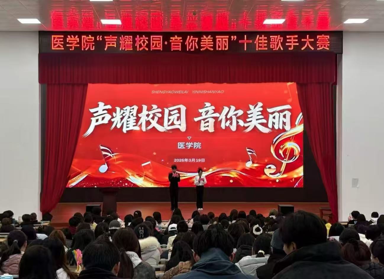 本站讯(医学院 刘倩)3月19日晚,医学院“声耀校园·音你美丽”十佳歌手大赛成功举办。本次大赛经初赛严格选拔,10名优秀选手晋级决赛,以歌声展现青春风采,以艺术涵养人文情怀,为校园文化建设注入鲜活力量。评委由校学生会及各二级学院学生会骨干组成。
