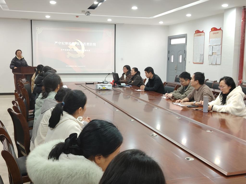 党课由党支部书记周俊杰同志主讲,从解读新时代党风廉政建设新形势,深入阐释一体推进“不敢腐、不能腐、不想腐” 战略方针;再结合医学领域典型案例,剖析药品采购、科研经费管理、招生录取等环节的廉政风险点,以案为鉴敲响廉洁警钟;随后领学《中国共产党廉洁自律准则》《中国共产党纪律处分条例》,明确党员行为高线与纪律底线;结合部门教学科研管理工作实际,要求全体党员将廉洁自律融入岗位履职各环节,主动接受监督、抓好家风建设,争做廉洁表率。