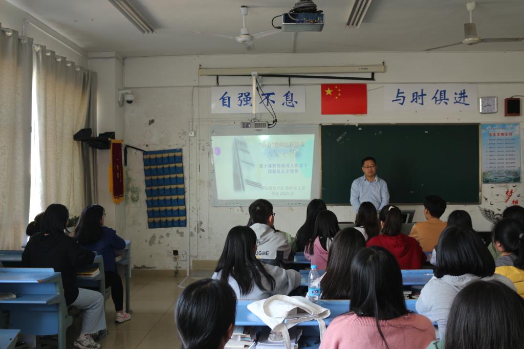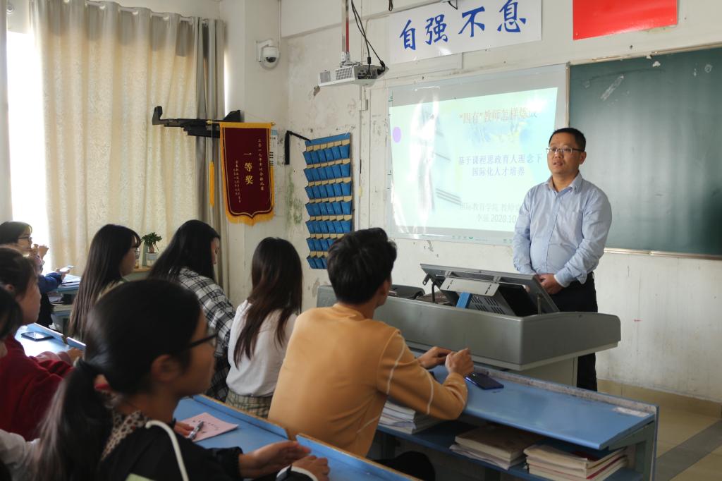 本站讯(国际教育学院 李强 学生记者 陈嘉伟)为在广大学生中有效开展学习贯彻习近平总书记有关教育的重要理论,并帮助2020级新生尽快明确未来职业发展要求,国际教育学院教师党支部10月22日下午在第一教学楼X603开展“支部挂点班级”活动。活动以讲座形式开展,主题为“四有好老师怎样炼成”,主讲老师为教师党支部教师李强,新生代表共计45人到现场聆听。