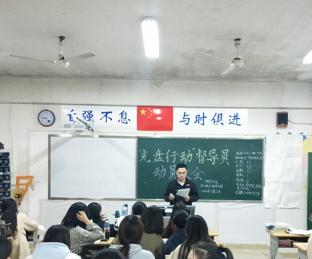 此次活动由学工处李兵兵老师倡议,团支部积极响应。为做好本次志愿服务活动,前期团支部召开动员大会,得到了支部全体团员青年一致赞同。在李老师与支部委员的多次研讨下,成立了由团干部、优秀团员为小组长,团员青年为组员的督导小组,中午用餐期间,在第一食堂和膳食中心做“光盘行动”督导员工作。将团支部变成人人有事做,人人能参与的服务型团支部。