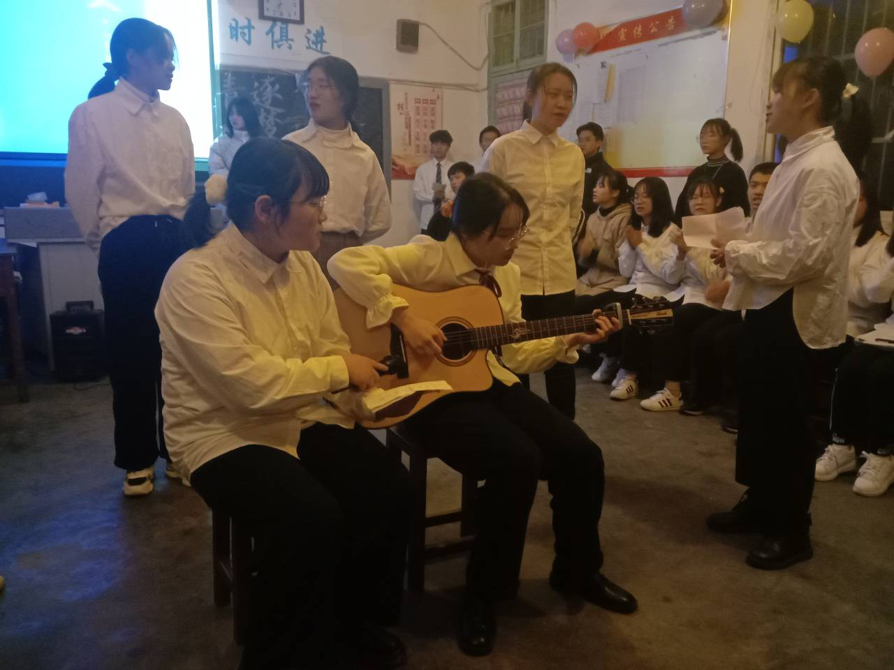 同学们在钢琴、吉他地伴奏下深情演唱《晴天》,完美演绎了校园时代的青涩与青春的美好。小品《上学那些事儿》带大家走进课堂,让大家在欢笑中回忆往昔的点滴,感慨青春的无畏。“可青春不就是这样吗?来时轰轰烈烈,初生牛犊不怕虎......”,饱含深情的诵读让大家感受到青春澎湃的激情,坚定了青春无悔的信念。最后,全班同学齐声合唱《岁月神偷》。