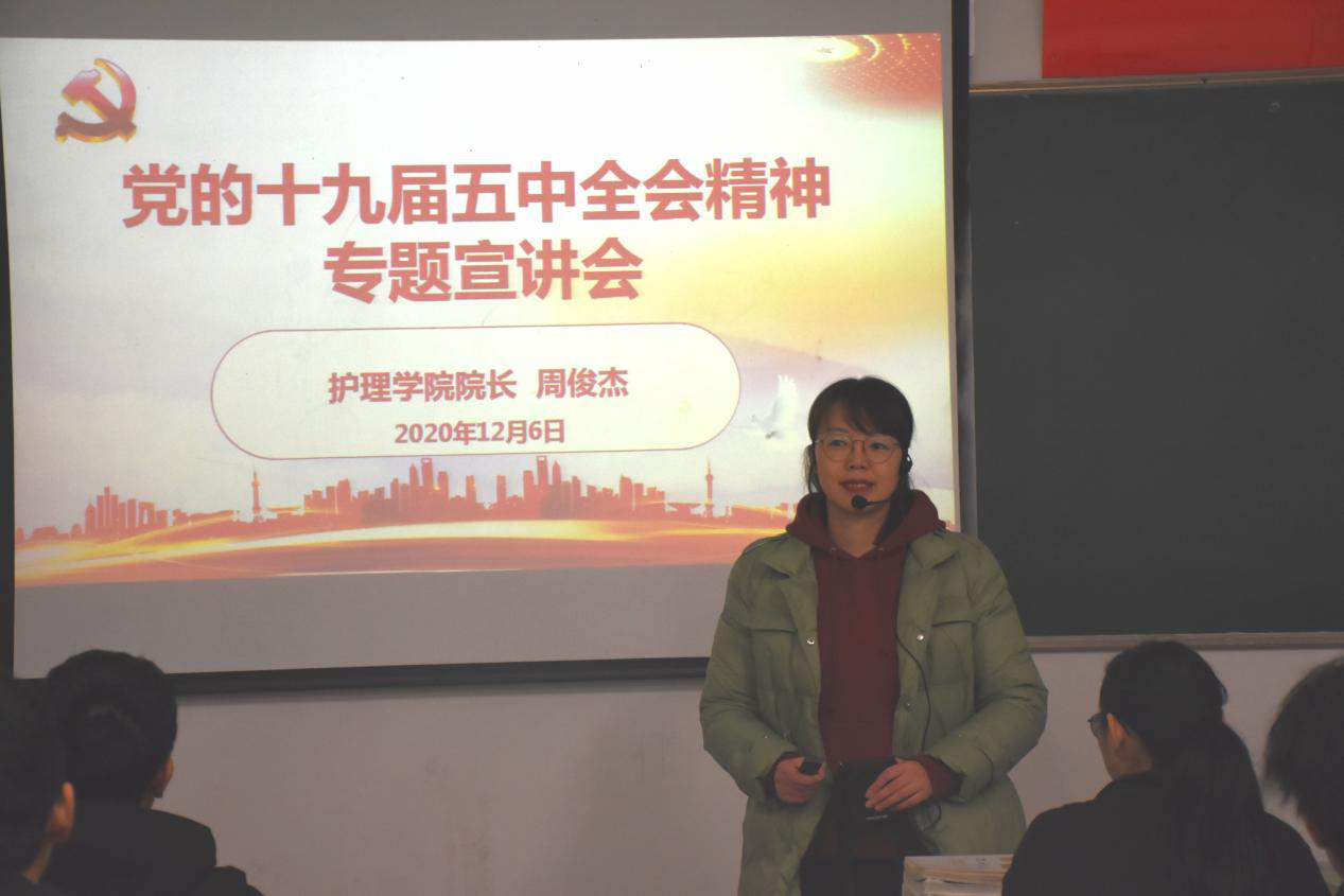 本站讯(护理学院 张蔺珊)为进一步引导广大青年大学生增强“四个意识”、坚定“四个自信”、做到“两个维护”,在护理学院兴起学习贯彻党的十九届五中全会精神的热潮,进一步统一思想认识、激发奋进力量,把引领青年大学生听党话跟党走持续做深做实。12月6日至15日,护理学院党总支围绕党的十九届五中全会精神宣讲开展支部联系班级活动,护理学院各支部分支部联系班级开展全会宣讲活动,党总支支委成员全员参加并分别联系班级开展全会宣讲活动。