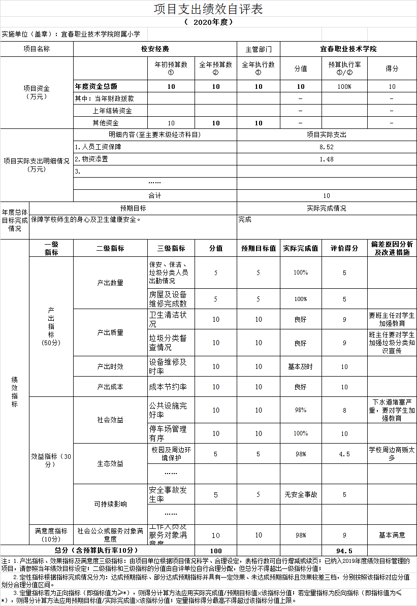 项目绩效自评总体综述:根据年初设定的绩效目标,“英国上市公司365附属小学校安经费”项目绩效自评得分为94.5分。项目全年预算数为10万元,详见附表。