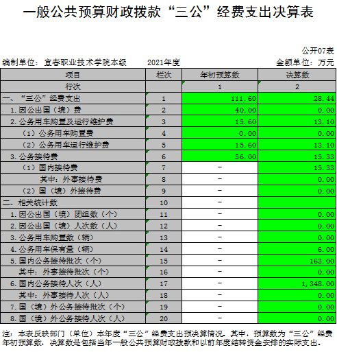 (二)公务接待费支出年初预算数为56万元,决算数为15.33万元,完成预算的27.38%,决算数较2020年增加2.03万元,增长15.26%,主要原因是加强与其他企业单位联系, 加强校企合作,扩大高职教育影响力。决算数较年初预算数减少的主要原因是:严格执行八项规定精神。全年国内公务接待163批,累计接待1348人次,其中外事接待0批,累计接待0人次,主要为:聘请专家学者培训、乡村振兴计划进一步推进。