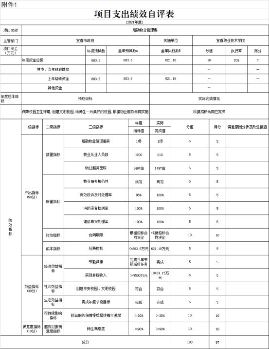 项目绩效自评总体综述:根据年初设定的绩效目标,“后勤物业管理费”项目绩效自评得分为97分。项目全年预算数为883.5万元,详见附表