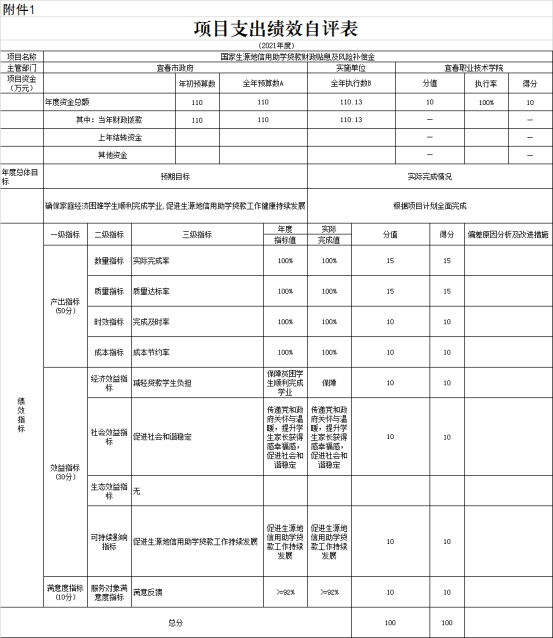 项目绩效自评总体综述:根据年初设定的绩效目标,“国家生源地信用助学贷款财政贴息及风险补偿金”项目绩效自评得分为100分。项目全年预算数为110万元,详见附表。