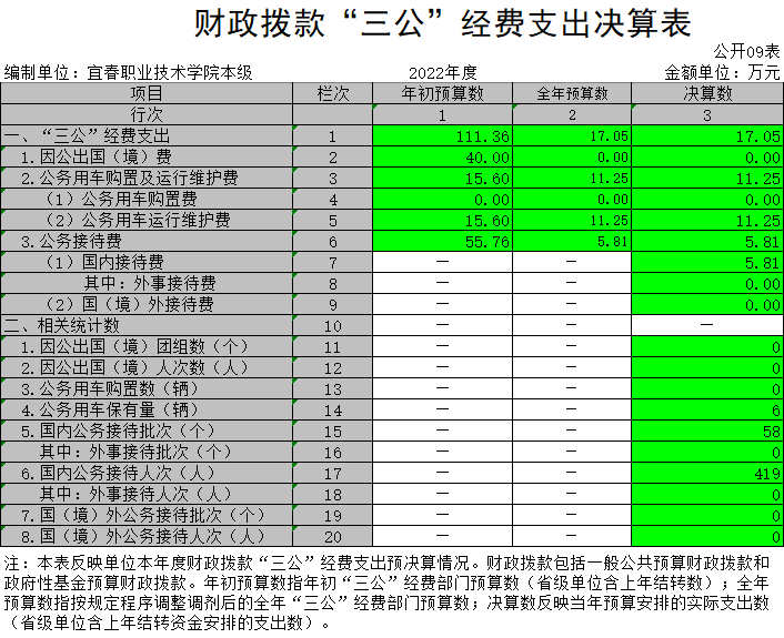 (六)“三公”经费:因公出国(境)费用反映单位公务出国(境)的国际旅费、国外城市间的交通费、住宿费、伙食费、培训费、公杂费等支出;公务接待费反映单位按规定开支的各类公务接待(含外宾接待)费用;公务用车运行维护费反映单位按规定保留的公务用车租用费、燃料费、维修费、过桥过路费、保险费、安全奖励费用等支出;公务用车购置反映单位公务用车车辆购置支出(含车辆购置税)