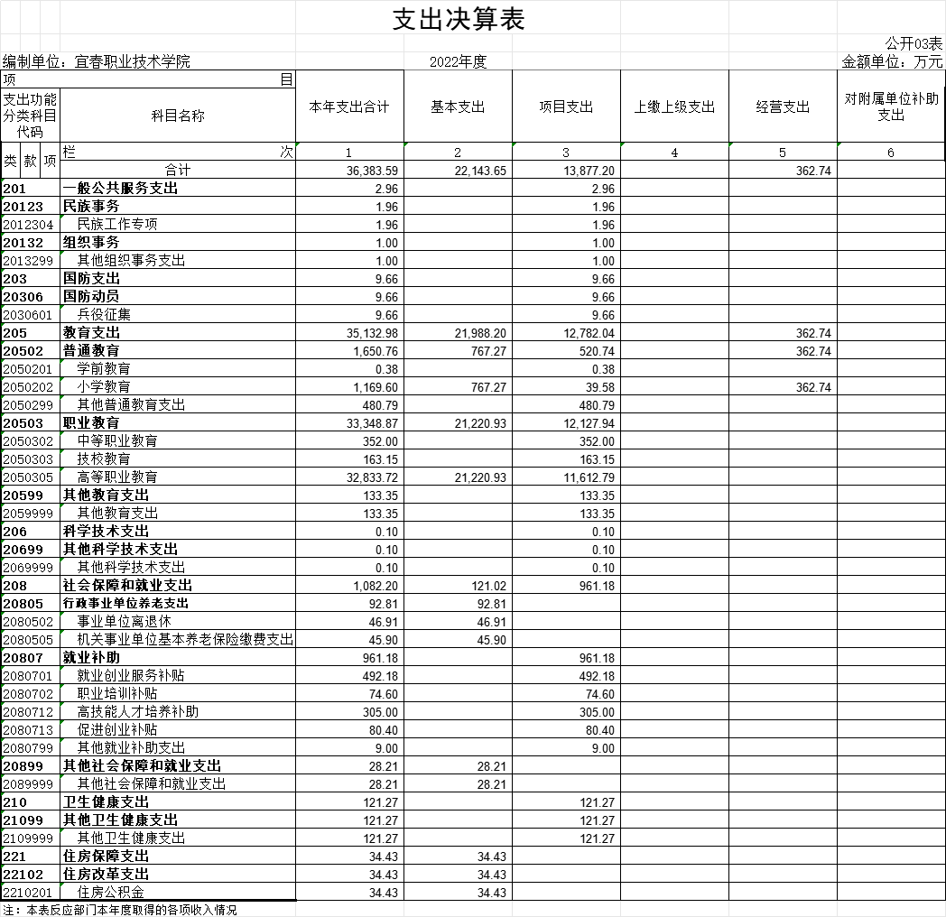 本年支出的具体构成为:基本支出22143.65万元,占60.86%;项目支出13877.2万元,占 38.14%;经营支出362.74万元,占1%;其他支出(对附属单位补助支出、上缴上级支出)0万元,占0%。