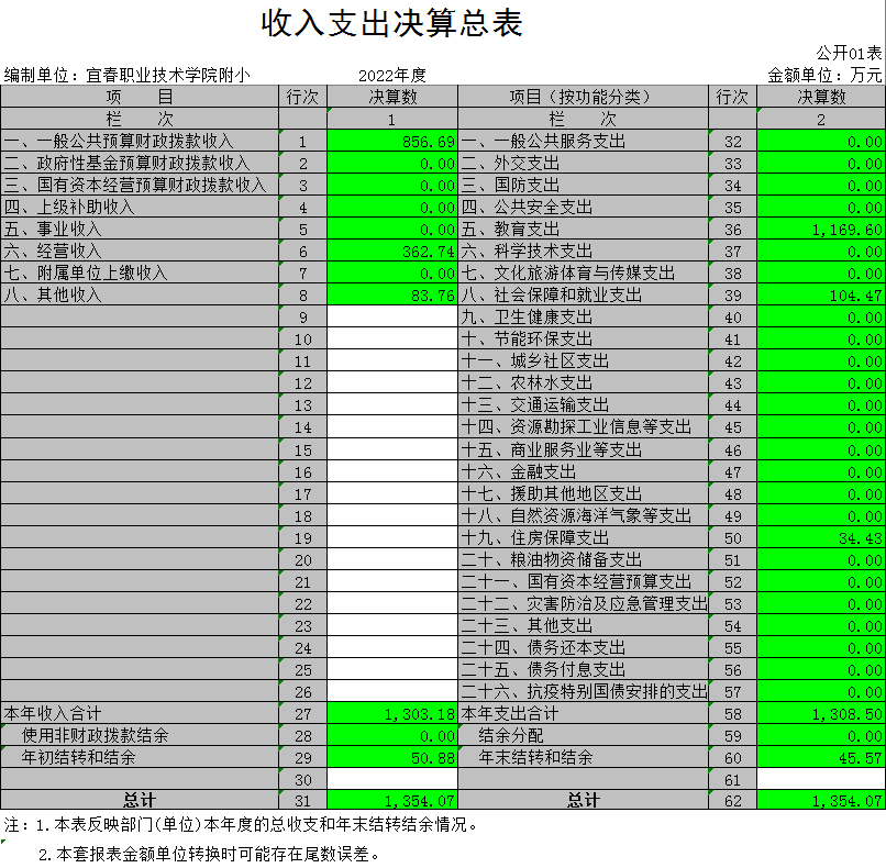 本单位2022年度收入总计1303.18万元,其中年初结转和结余50.88万元,较2021年增加34.52万元,增长211%;本年收入合计1354.07万元,较2021年增加37.66万元,增长38.5%,主要原因是:本年度增加了暑期托管,因此增加了经营收入。