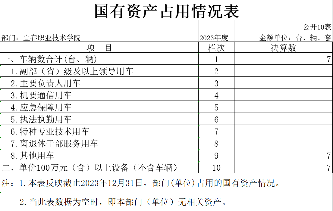 截止20231231日,本单位共有车辆7辆(台),其中:副部(省)级及以上领导用车0辆、主要负责人用车0辆、机要通信用车0辆、应急保障用车0辆、执法执勤用车0辆、特种专业技术用车0辆、离退休干部服务用车0辆、其他用车7辆,其他用车主要是用于教学运行中公务出差学习。本单位单价100万元(含)以上设备(不含车辆)7台(套)。