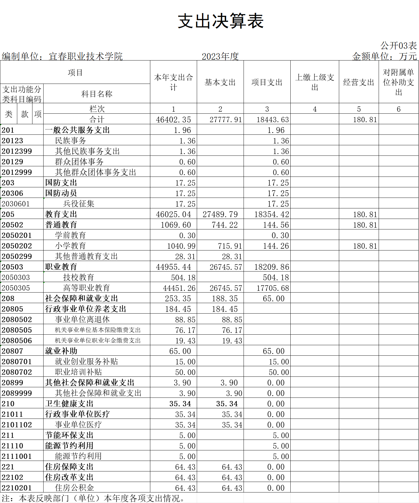 本年支出的具体构成:基本支出27777.91万元,占59.86%;项目支出18443.63万元,占39.75%;经营支出180.81万元,占0%;上缴上级支出0万元,占0%;对附属单位补助支出0万元,占0%