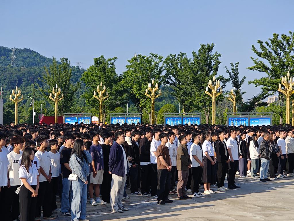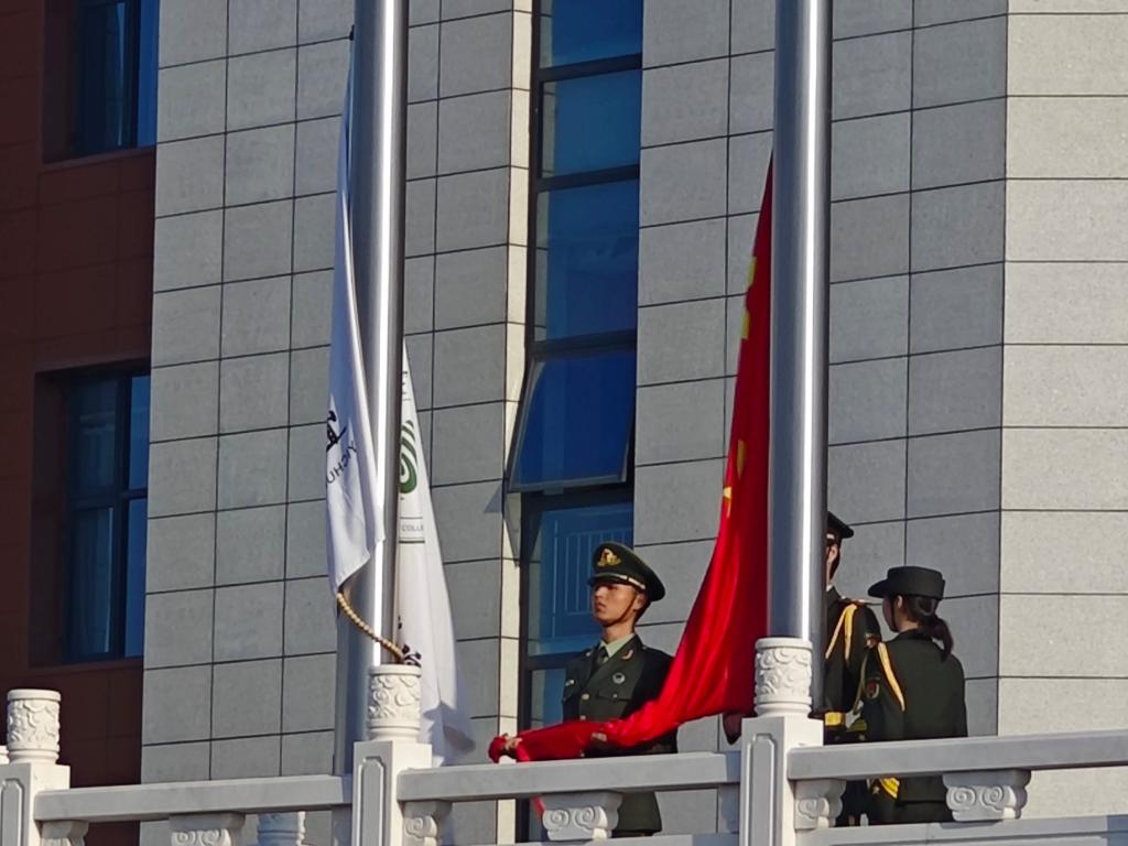 晨光熹微中,伴随着主持人铿锵有力的开场,国旗护卫队迈着整齐划一的步伐护送国旗入场。7时20分,《义勇军进行曲》响彻广场,全体师生肃立行注目礼,齐声高唱国歌。
