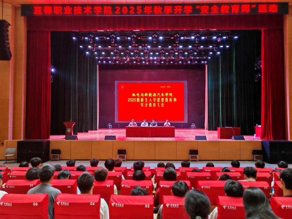 9月22日下午,机电与新能源汽车学院在出彩大会堂开展新生入学思想教育及安全教育大会。此次大会分为新生入学思想、反诈骗安全教育两个阶段,学院党总支书记赵琰、院长吴东平等学院领导及全体2025级学生参加。大会由学院党总支副书记周勤主持。