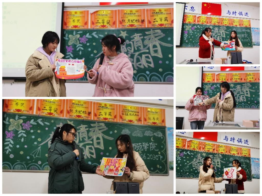 学前20307班同学慷慨激昂地朗诵无产阶级革命家方志敏的《可爱的中国》;学前20306、20307班全体同学饱含深情地合唱了《我和我的祖国》;团员代表对亲手绘制的“社会主义核心价值观”为主题的手抄报做了精彩介绍。活动最后,教学第二党支部书记彭慧洁从“感恩与祈祷”“经历与成长”“奋斗与希望”三个层次,为同学们送上了新年寄语。