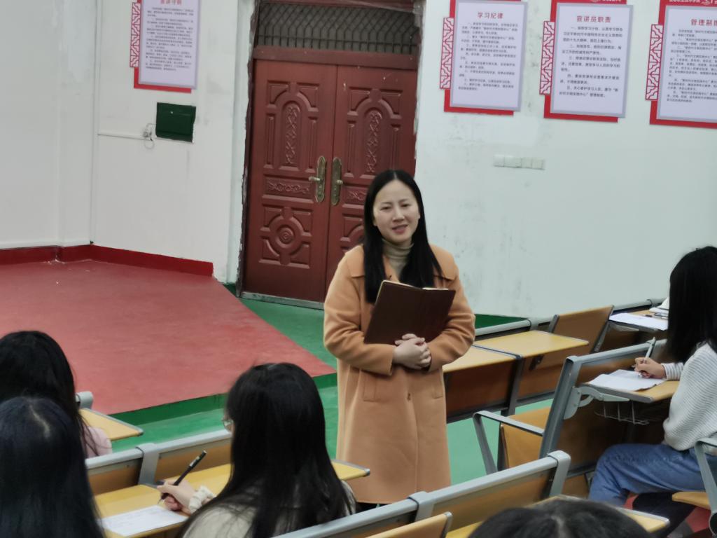 随后,马克思主义学院院长彭慧洁向大家介绍了星光社团历史,强调了社团“知行合一、内化于心、外化于行”的宗旨和精神。彭院长总结了社团的校内校外多种活动形式并对全体成员作出了要求和期望。她强调,要通过学史明理、增信、崇德、力行,要求全体学员讲政治、重品德、强能力、落实践,通过脚踏实地、一步一个脚印,成为一名德才兼备的人。