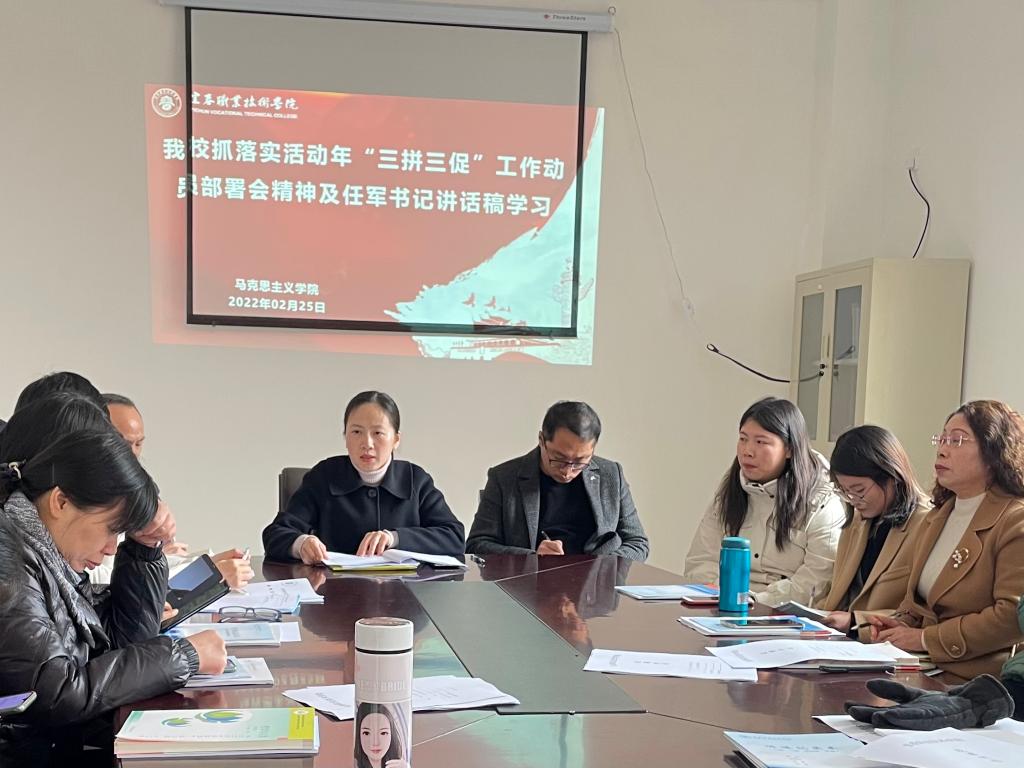 本站讯(马克思主义学院 卢凯)为保障新学期各项工作有序推进,深入落实学校抓落实活动年“三拼三促”相关精神及要求,2月25日下午3时,马克思主义学院于日新楼B305室召开了部门工作会议,会议由院长彭慧洁主持,全体教师参加。