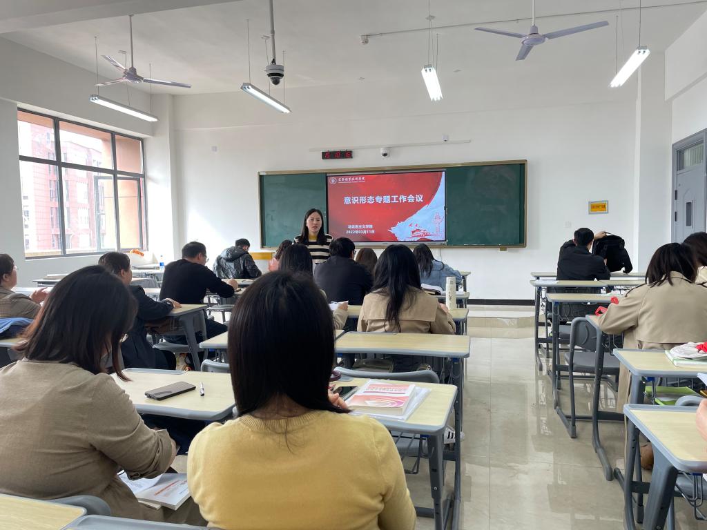 会议有两项议题,一是意识形态工作;二是普法工作。彭慧洁传达了学校关于加强意识形态工作的相关要求,同时结合我院理论学习情况和思修课建设实际提出了新要求。她指出,思政课教师要将意识形态工作有机融入到教学全过程,旗帜鲜明地批判错误思潮,弘扬主旋律,传播正能量,要敢于和善于回应学生提出的理论问题和实践问题,深入推进习近平新时代中国特色社会主义思想进教材、进课堂、进头脑的工作。她还传达了省委省教工委关于2022年普法工作会要点,会议要求深入学习贯彻习近平法治思想,系统总结了“七五”普法成效,全面部署了“八五”普法工作。她指出,思政课教师率先掌握好习近平法治思想,高标准高质量落实好普法教育工作的相关任务。
